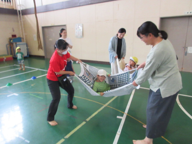 タオルの中に入ってユラユラしてもらったりと、好きな動きを親子で楽しみ、ニコニコ笑顔の子どもたちでした🥰