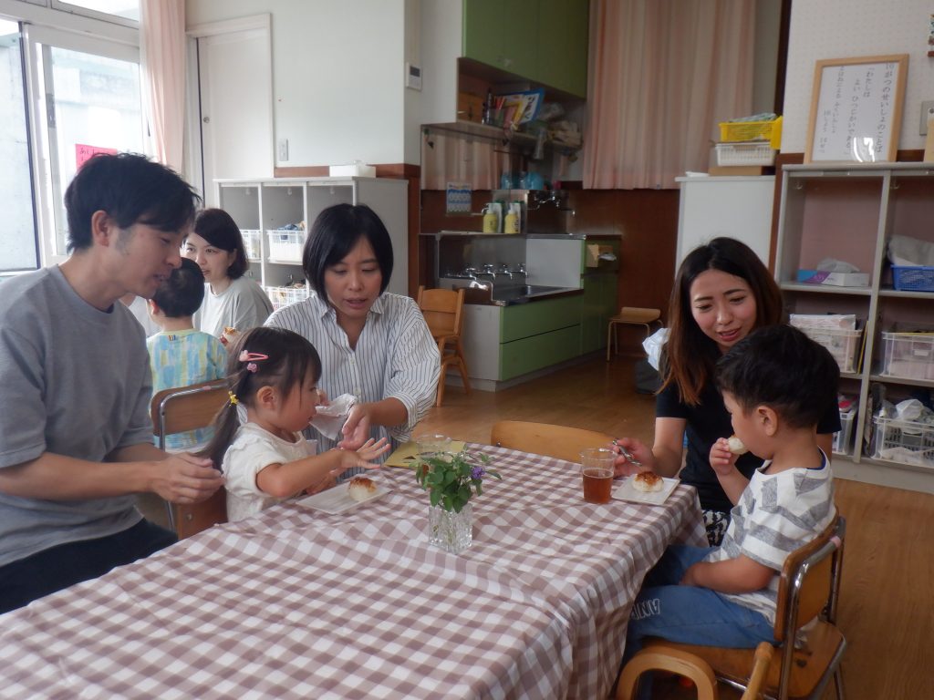 たくさん遊んでお腹がすいた子どもたち。お茶を飲んだり、園のおやつ人気メニューの焼きおにぎりを食べました。