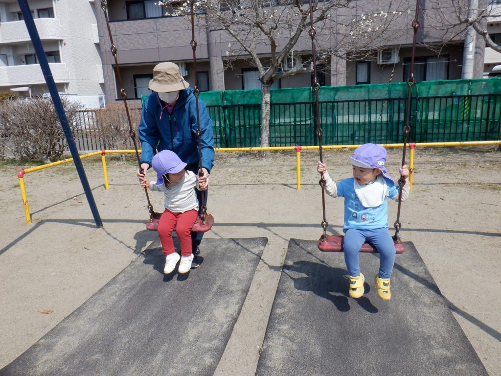 ブランコの順番がくるまで数をかぞえ、「おまけのおまけのきしゃぽっぽ~」と手を叩いて
