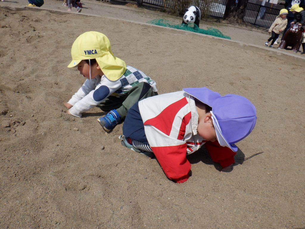 公園に着くと、砂場の砂を触ってみた子どもたち。「わあ!あったかいよ!」とびっくりした様子で、手を砂の中に入れていました🌟