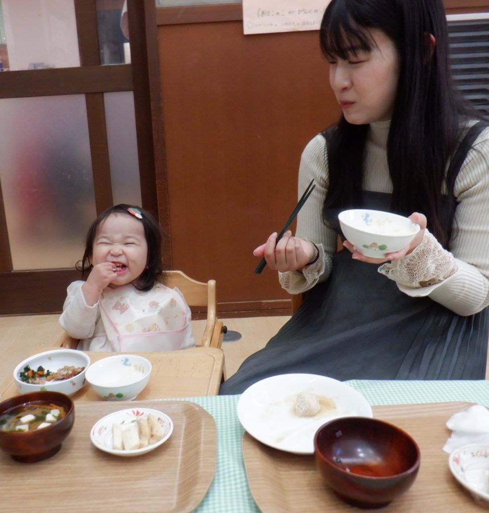 お母さんと一緒で安心なのか、喜んで園の離乳食(後期)を食べてくれました。