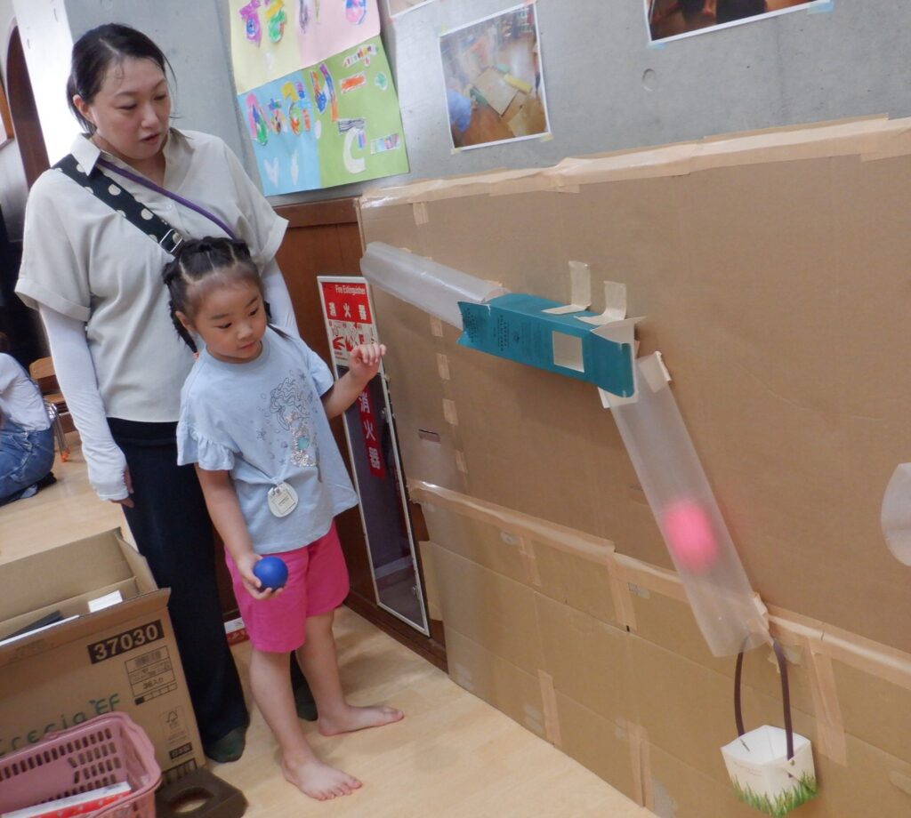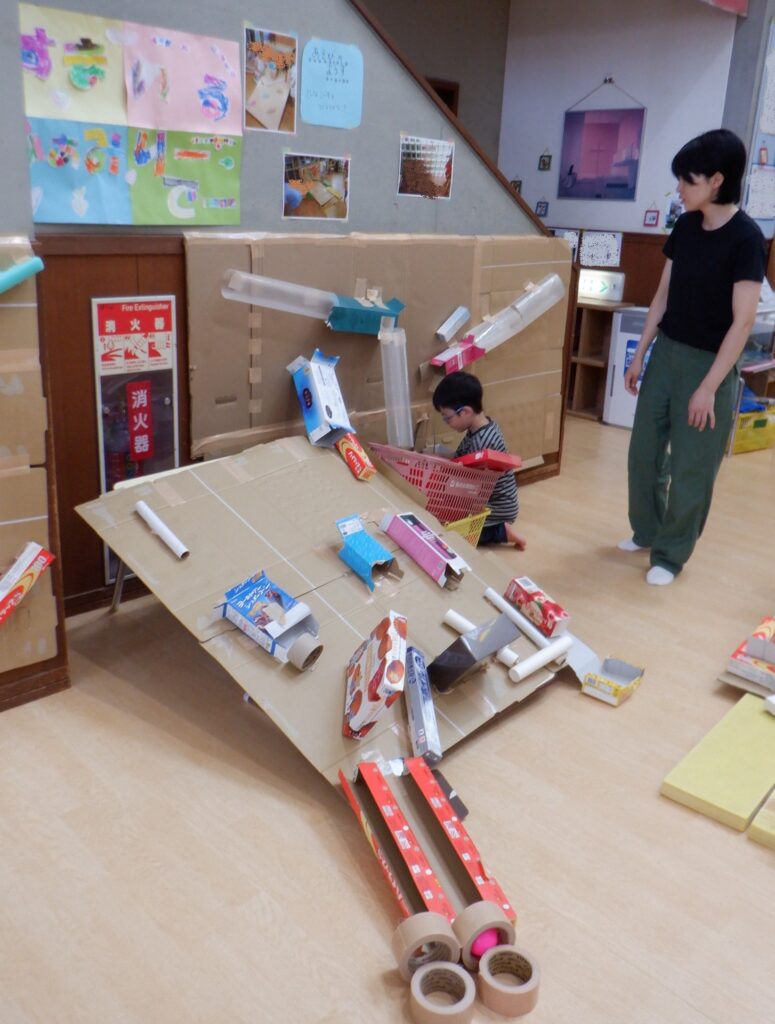 空き箱などの廃材を使って、ボールが転がるようにコース作りを楽しみました。
