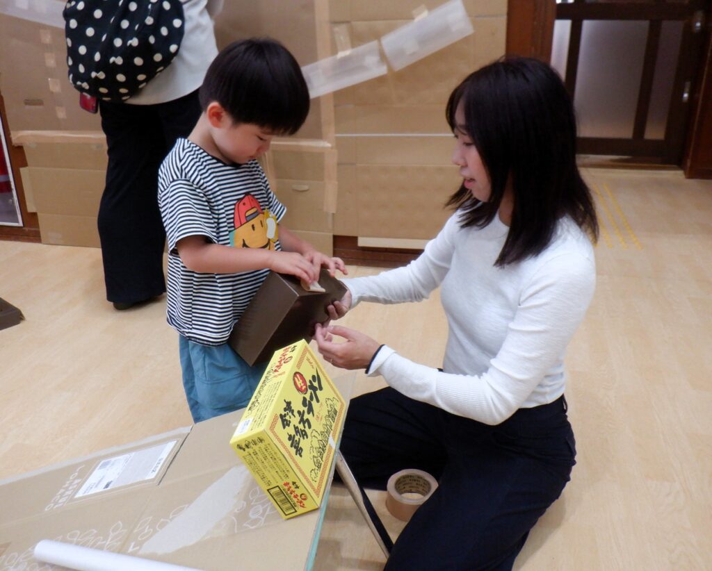おうちの人と一緒に空き箱を貼ったり、ボールを転がしたりと笑顔で楽しむ子どもたち。
