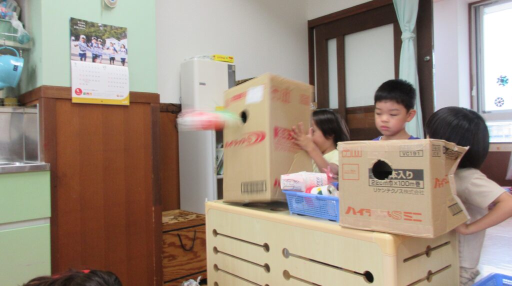 「とんだー!」「あっちまで行ったよ!」とロケットが飛ぶことを喜んだり、「ぼくが一番!」とロケットの飛距離を比べたりと楽しんでいます🎵