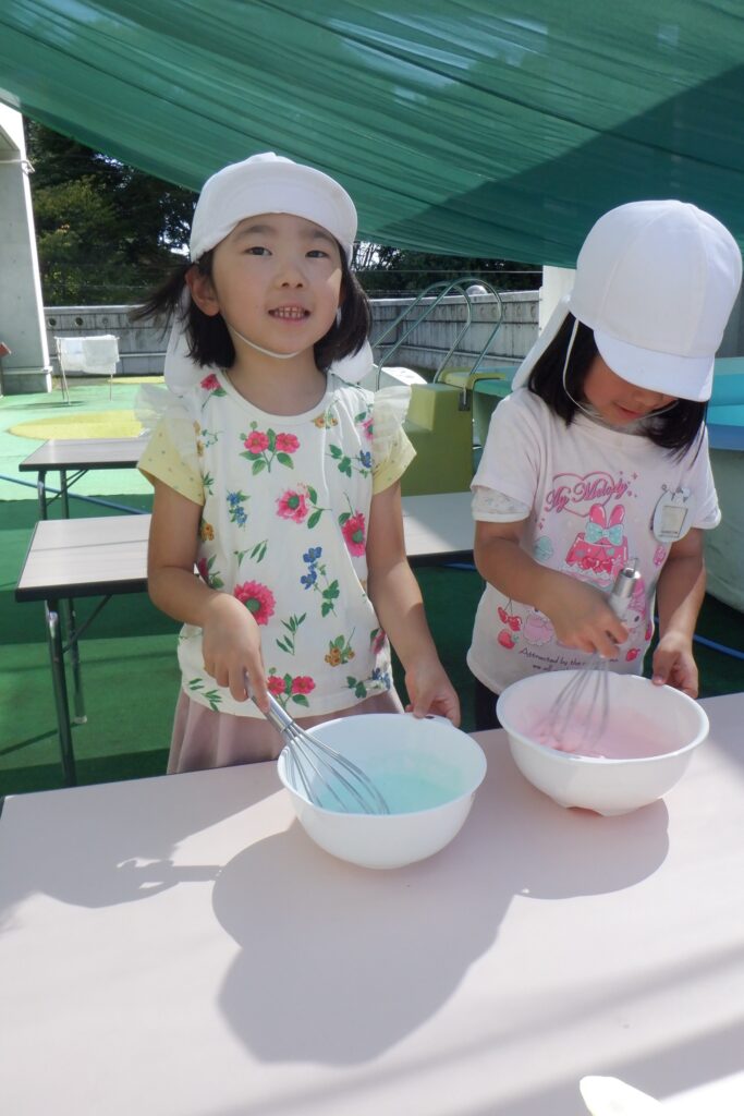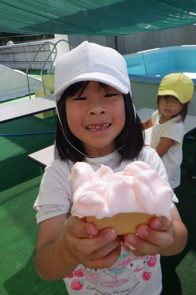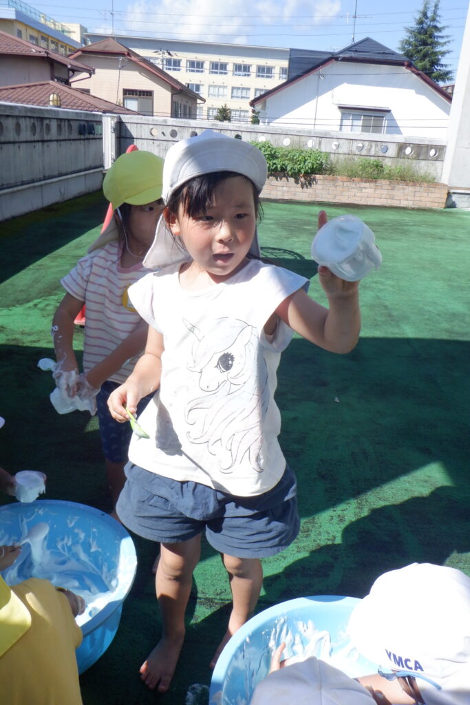手ですくって、ふわふわ、とろとろなど泡の感触を味わったり、カップに入れてスイーツ作りをしたりと、思い思いに楽しんでいます♪