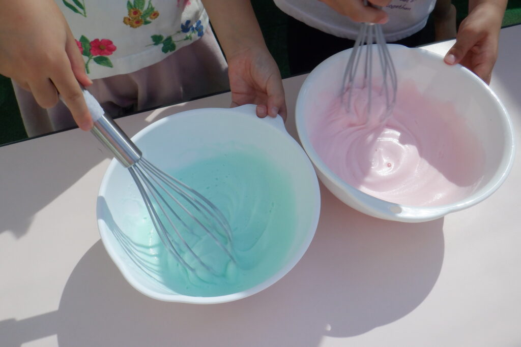 おろし器で削った石鹸と色水を混ぜ、泡だて器でかき混ぜていくと・・・