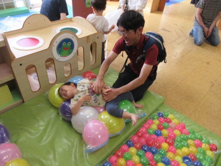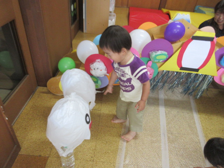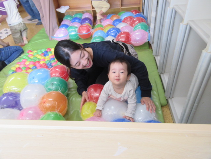 『身体を動かすコーナー』では、トンネルをくぐったり風船やボールマットで遊びました!