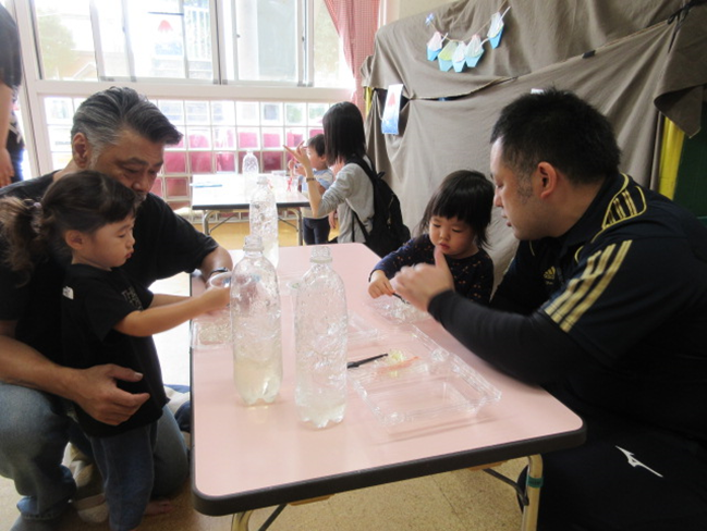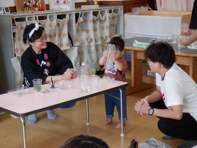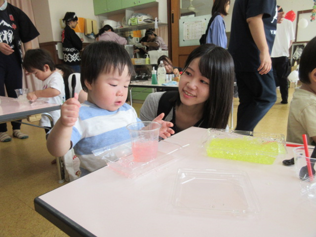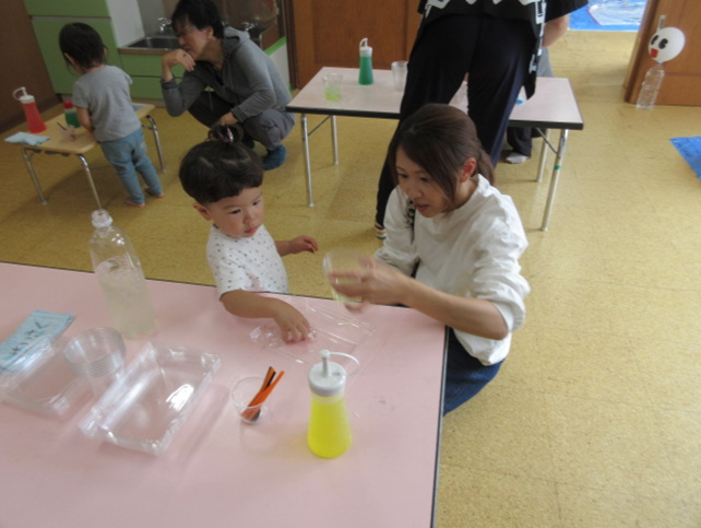 普段の保育でも感触遊びを楽しんでいる子どもたち。保護者の皆さんが驚くほど大胆にゼラチンを混ぜ合わせる姿もありました!
