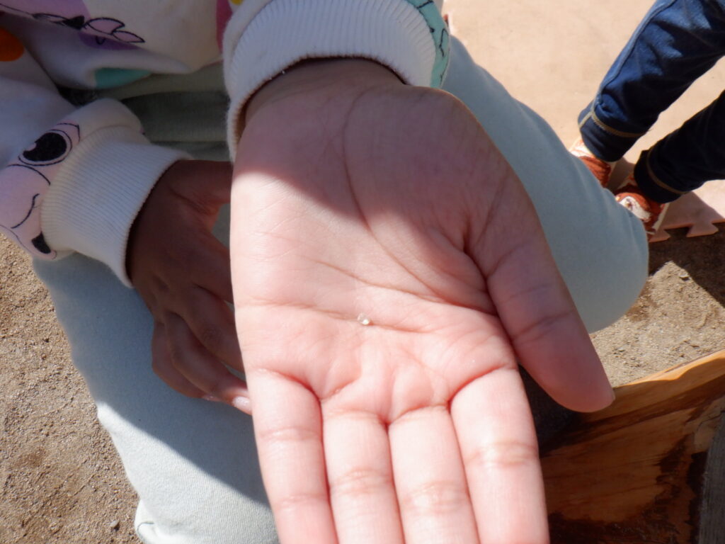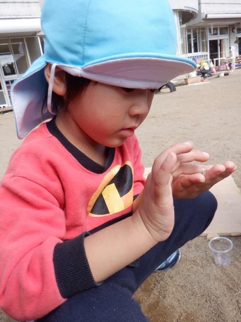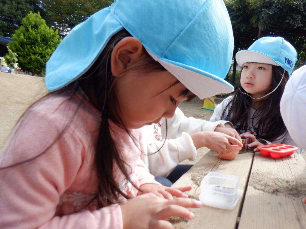冷たくなってきた風が吹く園庭で何やらしゃがみこんでいる子どもたち…。