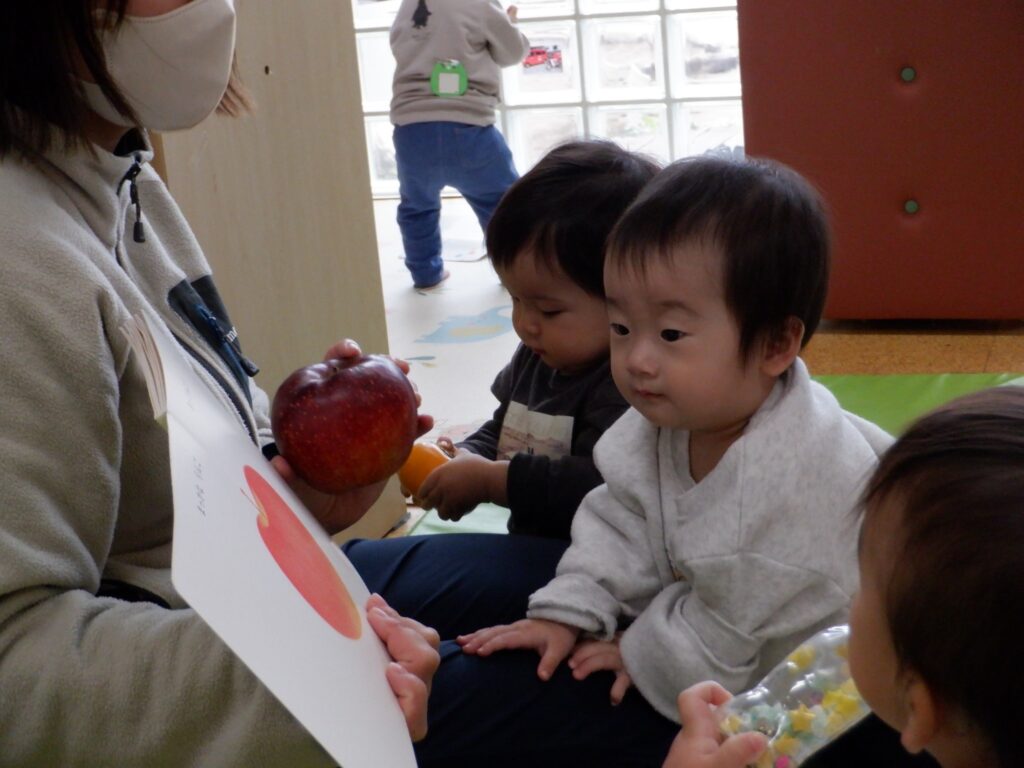 親しんでいる絵本にりんごが載っており、保育者に絵本を持ってきたお子さんもいました。
