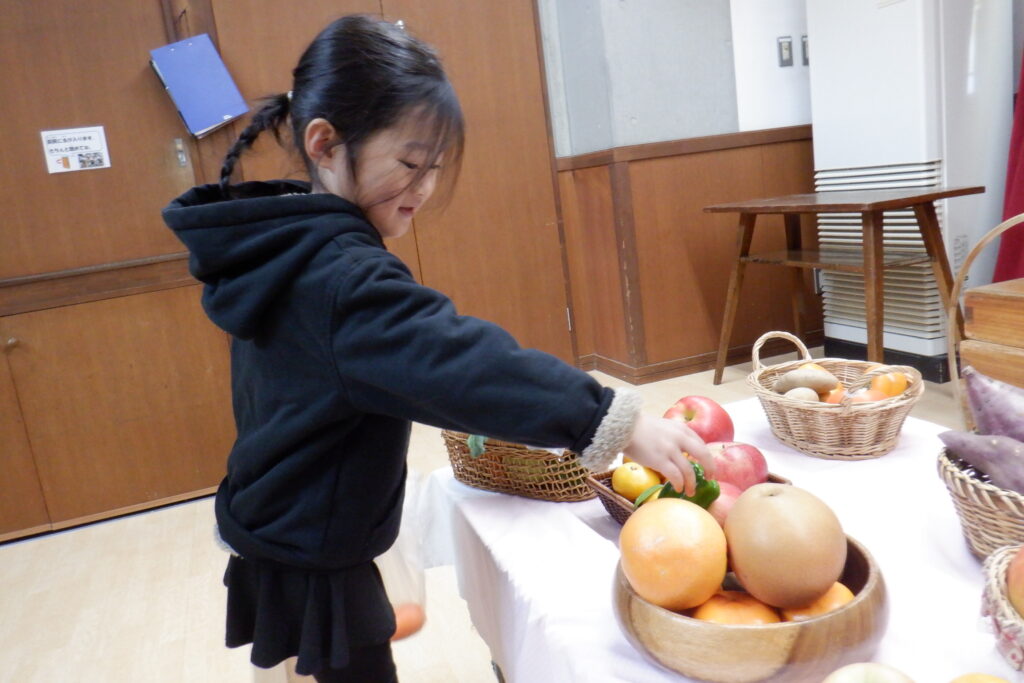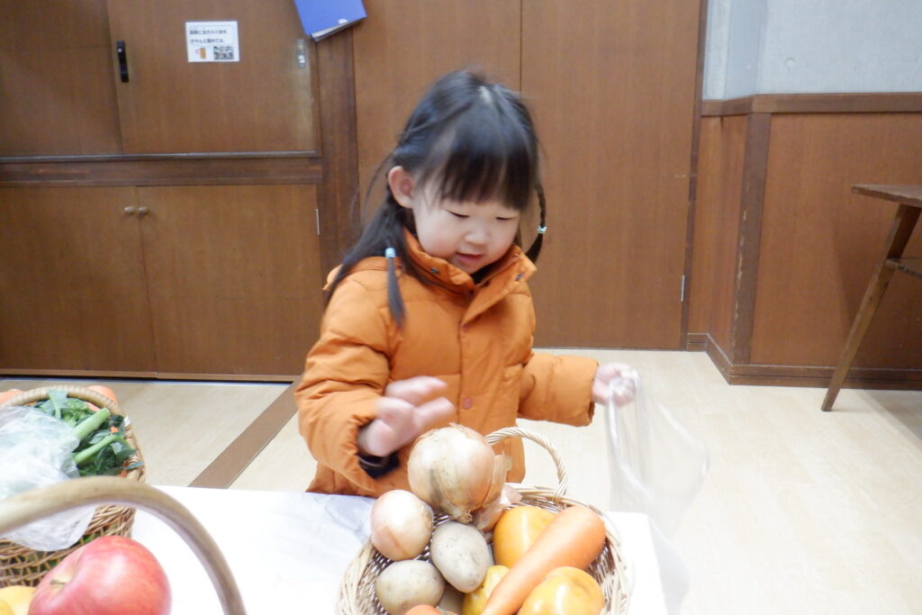 「私はゆずを持ってきたの」「にんじんを持ってきたよ」など自分が捧げた野菜や果物を保育者に教えてくれました。