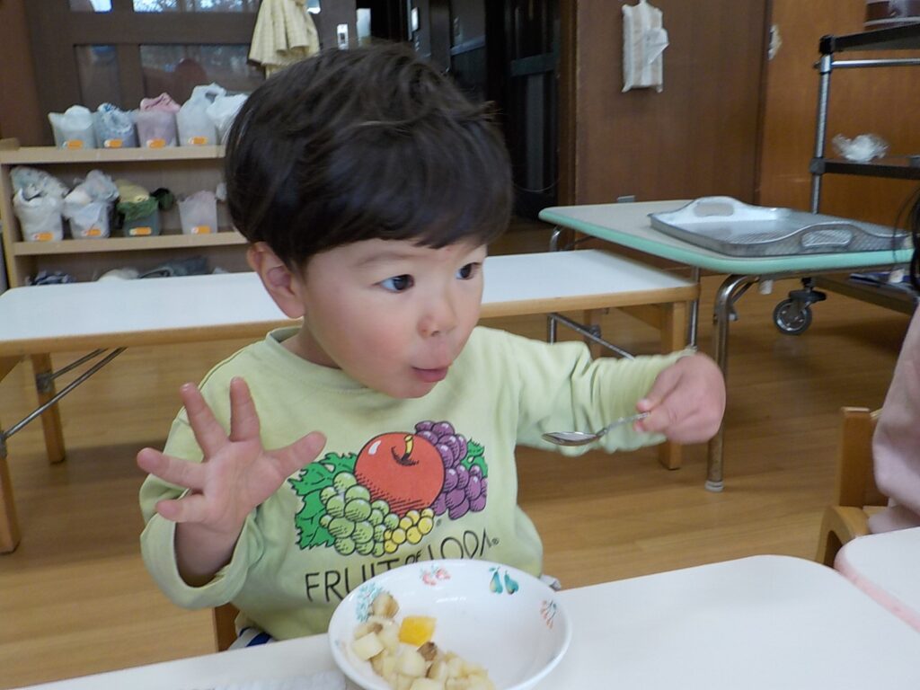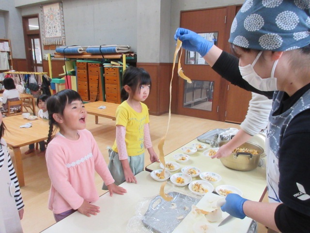 厨房職員が子どもたちの前で果物の皮をむいてくれました!